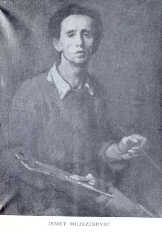 Ismet Mujezinović često svoj lik posuđuje figurama na svojim velikim ratnim kompozicijama (borac u kompozicji “Prijelaz preko Neretve”, dva puta ustanik u kompoziciji “Poziv na ustanak”). Od samostalnih autoportreta, jedan je romantični, uzbuđeni lik sa crvenom maramom oko glave okrenute tri četvrti, na ljubičastoj pozadini, nedatiran, a drugi je iz 1950. na kome je dao svoju sjedeću figuru s kistom u lijevoj i paletom u desnoj ruci sa žutim okerom i zelenim sjenkama na licu na tamnocrvenoj pozadini.